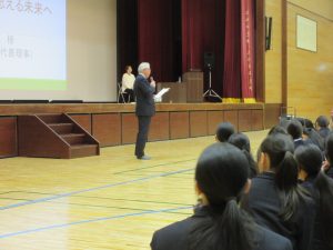 親を頼ることができない若者たちを幅広く支援されてこられた山下様のメッセージは心に響きました。講演の最後に、「自分の人生で大切なことを決めるときあなたの気持ち・思いはとても大切、あなたの人生の主役はあなた、生まれるために生まれてきた大切な存在、自分の人生、自分の命を大切に」と締めくくられました。講演を受けて高校生徒会長の西島さんがお礼の言葉を述べました。