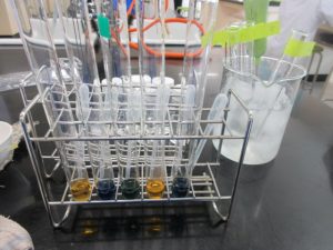透明な液体が入った5つの容器。ガスバーナー(1)アルミホイルカップ(10)三脚(1)金網(1)軍手(4枚)五感(不明…)スポイト(5)BTB(5液)試験管(5)試験管立て(1)付箋(10)