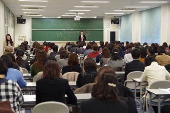 2学年は、進路別分科会が行われました。国公立大学希望者には北九州予備校の大山純治氏による講演会、公務員希望者には校務員セミナールの渡邉康祐氏からの説明、就職希望者に対しては本校の緒方教諭からの説明が行われました。他に、福岡大学・崇城大学・熊本学園大学・九州ルーテル学院大学・くまもと保健科学大学・九週看護福祉大学・尚絅大学・中央リハビリテーション学院からおいでいただき学校の説明をしていただきました。各大学と専門学校の説明は2回行っていただき、保護者の方ばかりでなく希望する生徒も2つの学校を聴講できるように計画しました。2学年は学級懇談会終了後に崇城大学の慶賓館で懇親会も行われました。