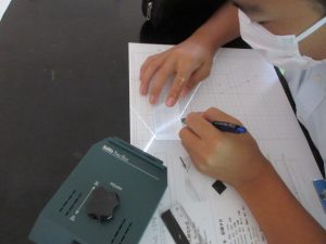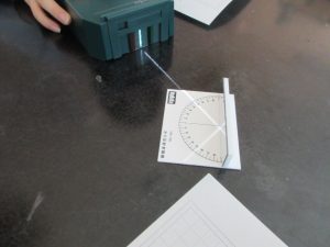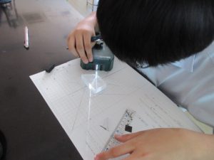 10月10日(金)中学1年生の理科の授業で、「直方体のガラスを通りぬける光の道筋」の実験を行いました。