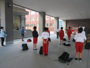 10月11日(土)文徳中学校1年生で稲刈り体験実習を行いました。菊池農業高校とJA菊池さんとの共同で実施しました。体育服に着替え、スクールバスで移動し、菊池農業高校の圃場で、農業科の生徒さんからノコギリガマを使った稲の刈り方について等の説明を聞いた後、稲刈りを実施しました。7月5日に田植えをしたヒノヒカリの稲を刈り取りました。刈り取った稲はコンバインで脱穀しました。