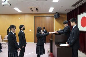 その後、新生徒会長より、文化図書委員長、保健体育委員長、生活美化委員長、学級委員長の委嘱が行われ、新たな生徒会体制が正式に組織されました。